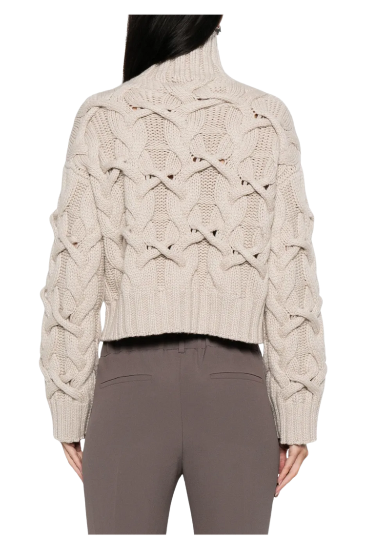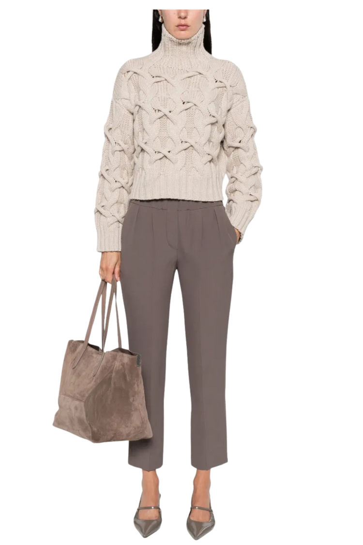 Brunello Cucinelli’s cashmere sweater showcases a distinctive interlocking cable-knit for a sculptural 3D effect. Finished with a chunky turtleneck and ribbed trims, it blends warmth with elegance. In a versatile natural tone, it pairs effortlessly with relaxed tailoring or elevates casual looks with refined sophistication.