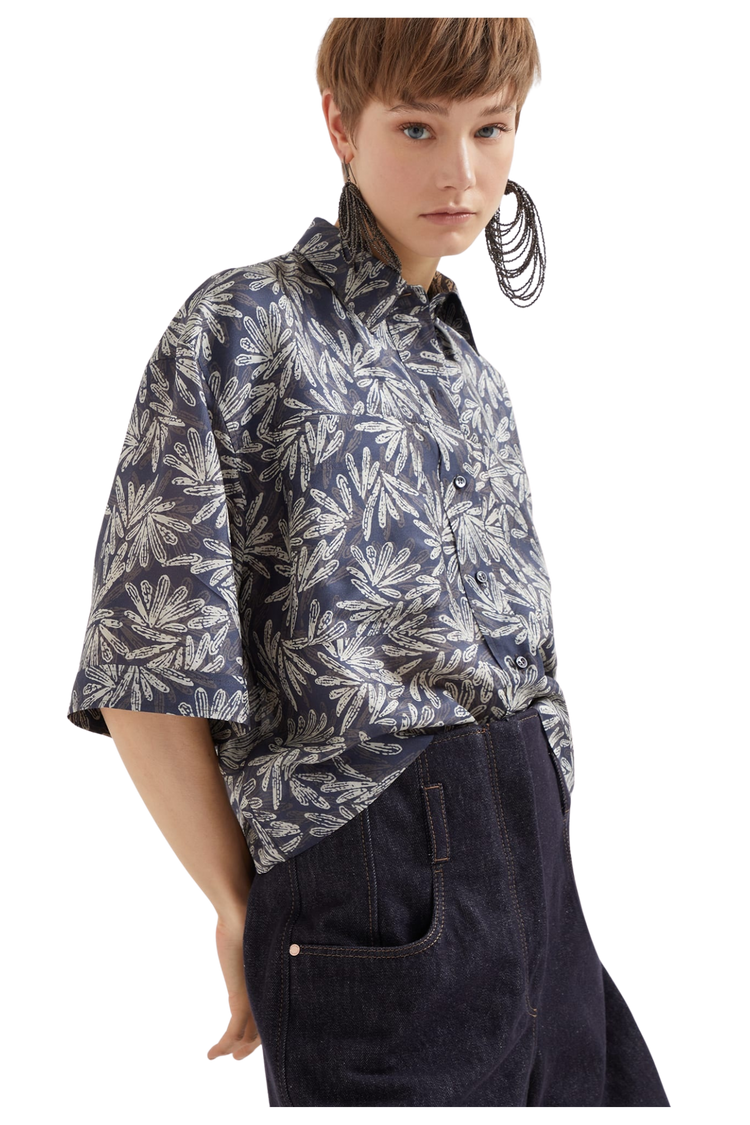 The Brunello Cucinelli Women’s Silk Fern Print Pongee Shirt with Monili combines fluid elegance with modern ease. Crafted from ultra-light silk, it features a refined fern-inspired print in seasonal tones. A cropped hem and wide sleeves enhance its relaxed silhouette, while subtle monili accents add a signature touch of sophistication and femininity.