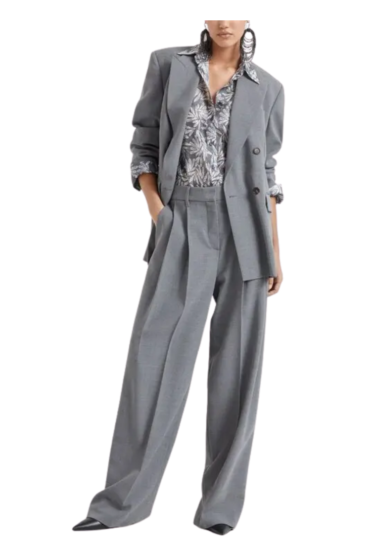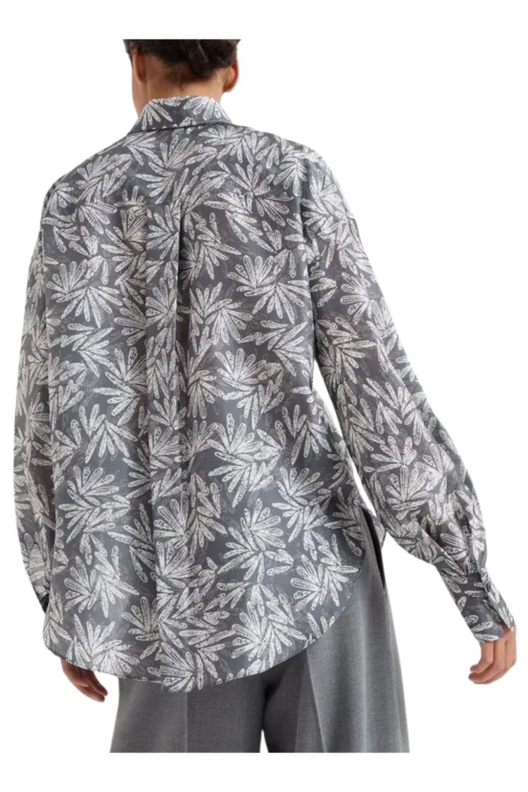Brunello Cucinelli’s abstract-print silk shirt blends timeless tailoring with modern artistry. Crafted in soft grey silk, it features a classic collar, button-front closure, and long sleeves with buttoned cuffs. A curved hem enhances versatility, while the signature Monili chain detail lends a refined touch of understated luxury.