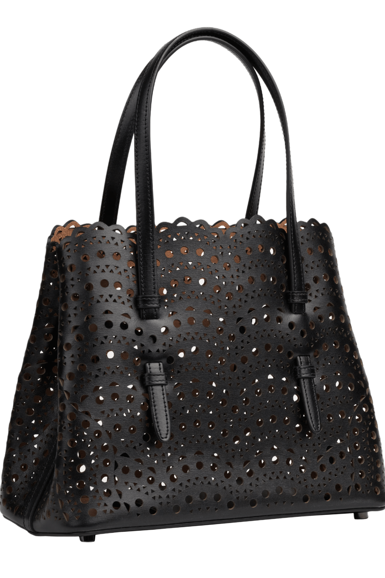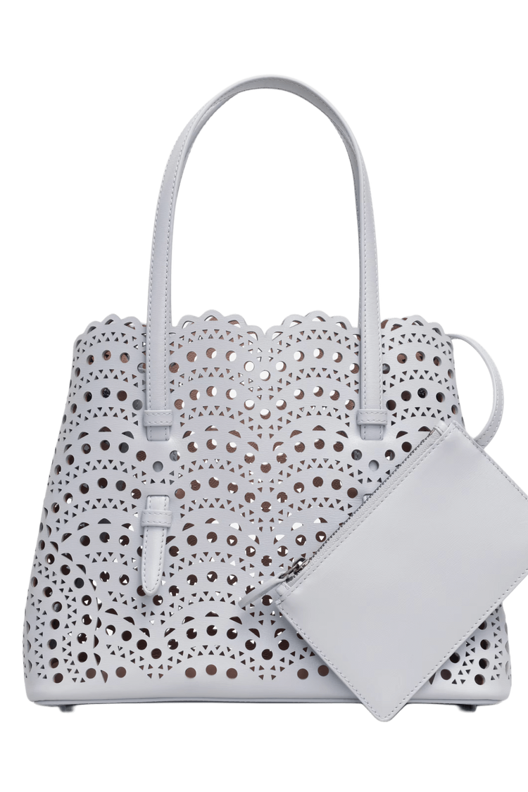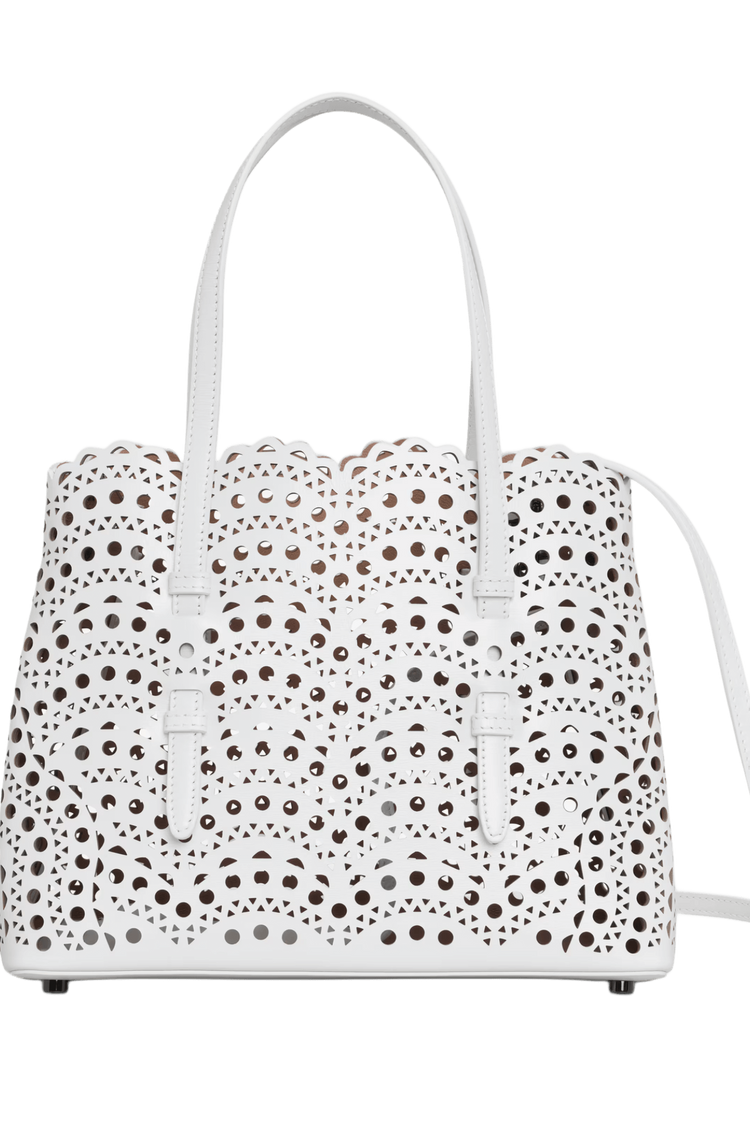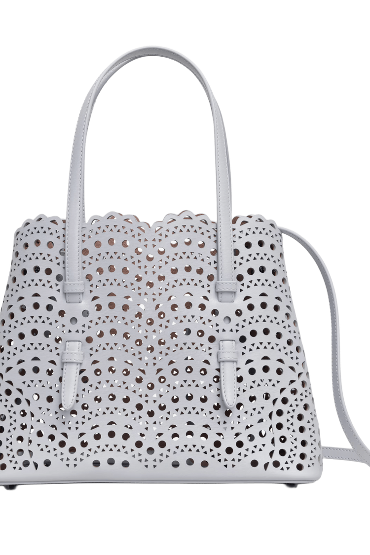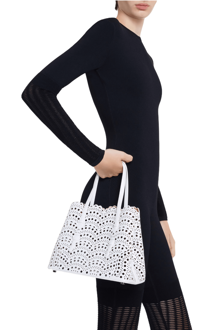 The Mina 25 in Vienne Wave calfskin evokes Alaïa’s architectural mastery through its rhythmic laser-cut pattern—an elegant interplay of light, shadow, and form. Designed for the discerning minimalist, it moves with you from gallery mornings to candlelit evenings, a sculptural statement of quiet power and poetic utility.