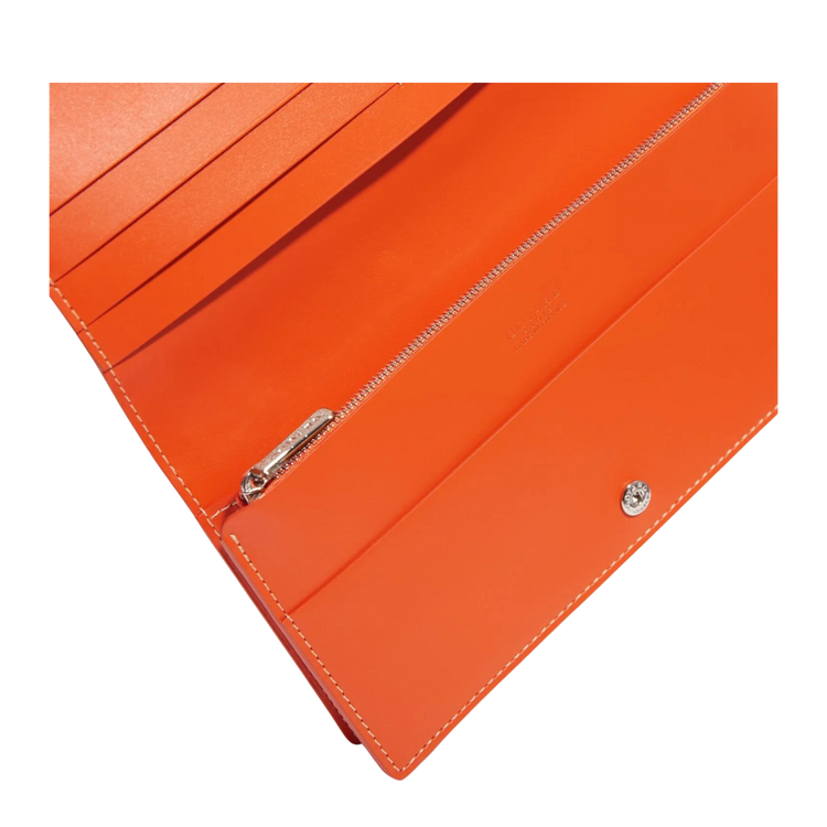 6 card pockets, 2 large flat pockets, gusset pocket for notes, zip change pocket