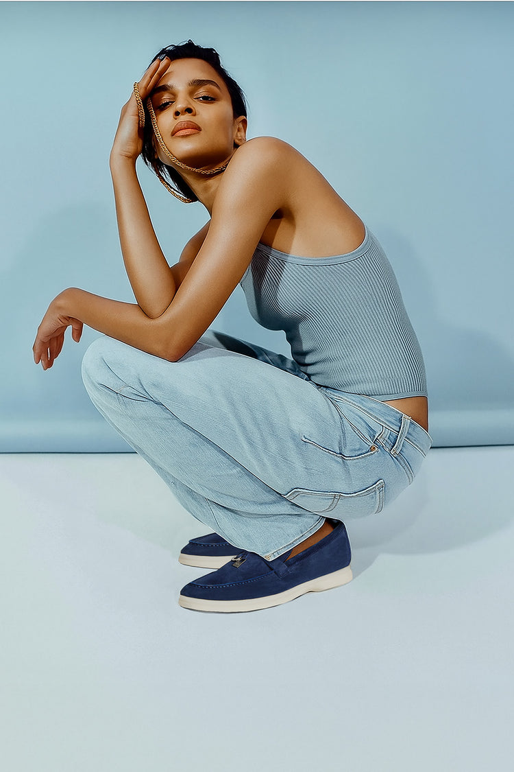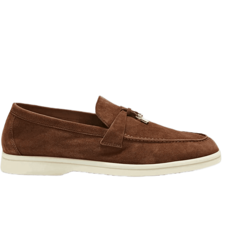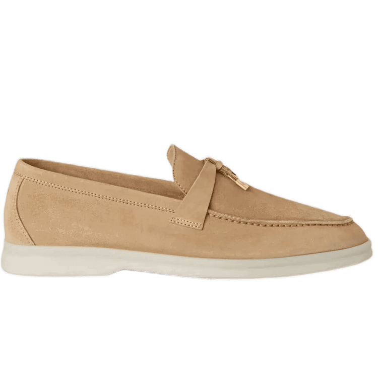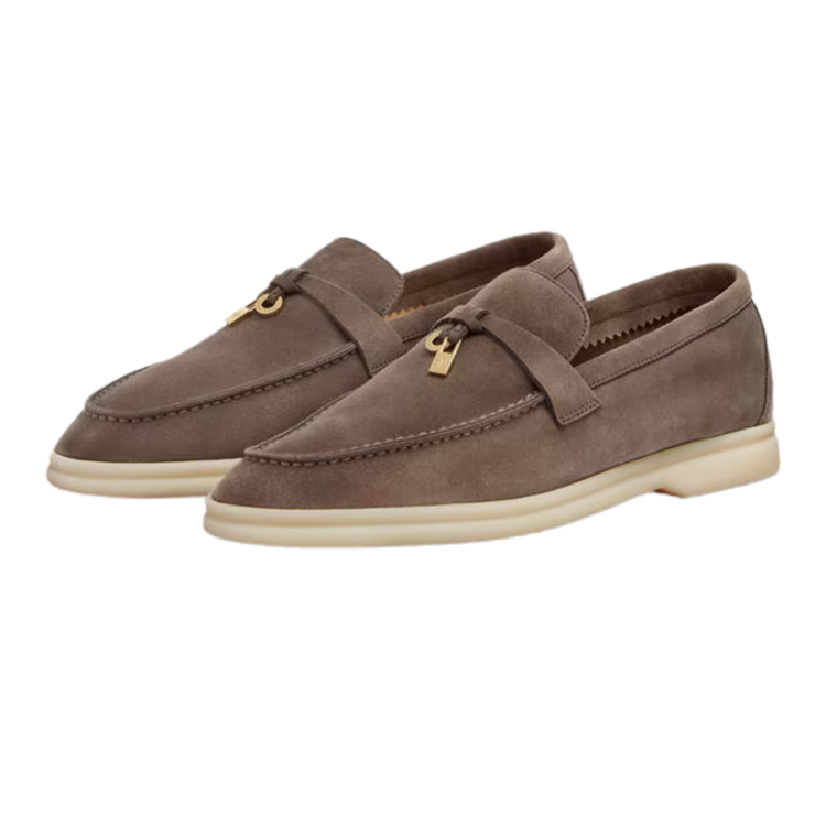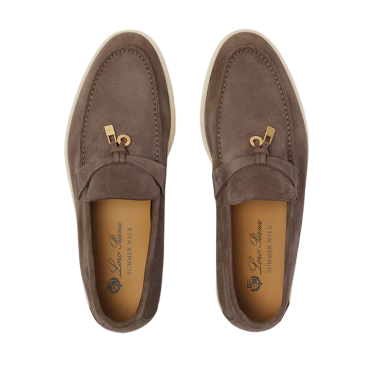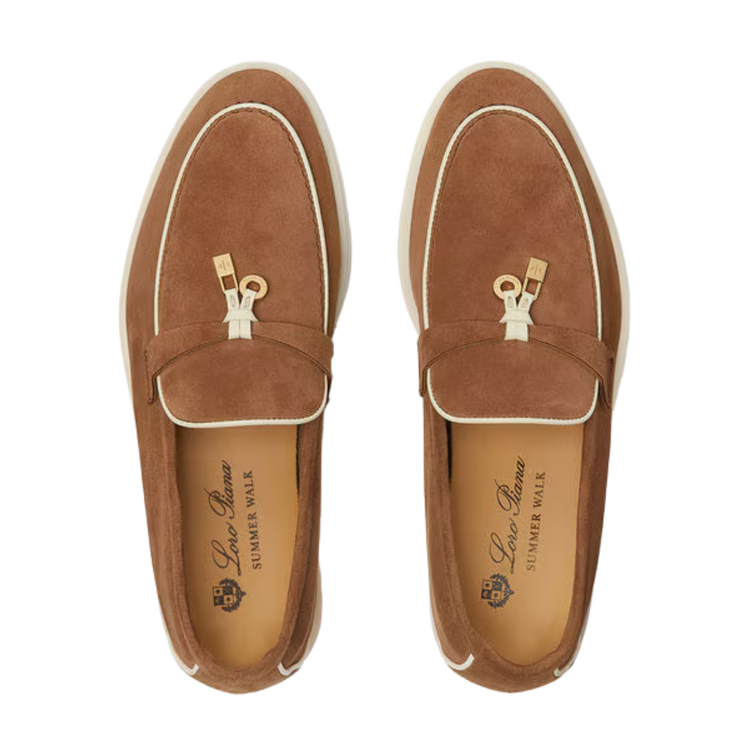 Loro Piana Women's Summer Charms Walk Loafers combine soft suede with durable rubber soles and elegant My Charms details, perfect for summer adventures by sea or city.