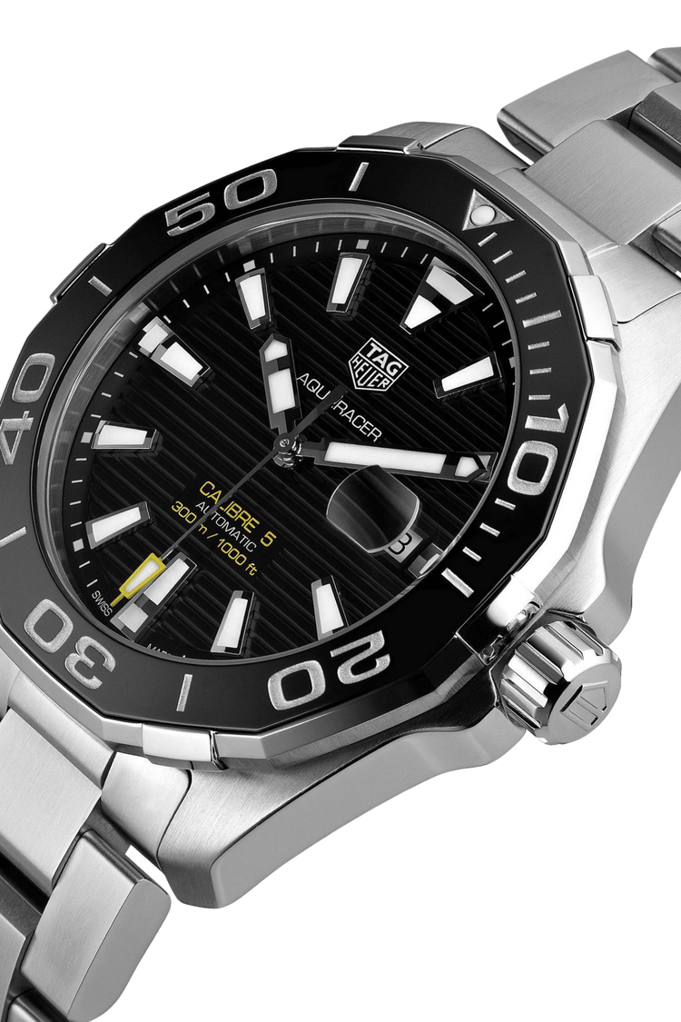 The TAG Heuer Aquaracer Calibre 5 Automatic blends refined style with professional dive capability, driven by a Swiss automatic movement and engineered for 300-meter water resistance, a screw-down crown, and unidirectional bezel. Its luminous markers ensure legibility in all conditions, embodying TAG Heuer’s legacy of precision for both elevated occasions and aquatic exploration.