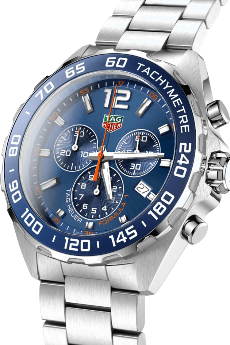 The TAG Heuer Formula 1 Chronograph channels motorsport prestige with its iconic 43mm tonneau-shaped steel case, vibrant blue dial, and integrated tachymeter scale—inspired by legendary racing circuits. Powered by high-precision quartz chronograph functionality and protected by scratch-resistant sapphire crystal, it delivers racetrack-ready performance fused with versatile sophistication for daily elegance.