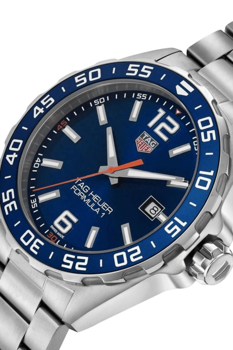 The TAG Heuer Formula 1 Quartz embodies Formula One spirit with its bold 43mm stainless steel case, sunray blue dial, and iconic "6" and "12" numerals—a direct nod to racing heritage. Powered by Swiss quartz precision and built for enduring performance, it merges racetrack adrenaline with timeless sophistication for daily achievement.
