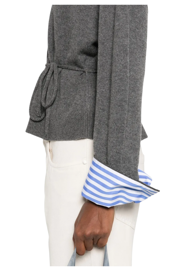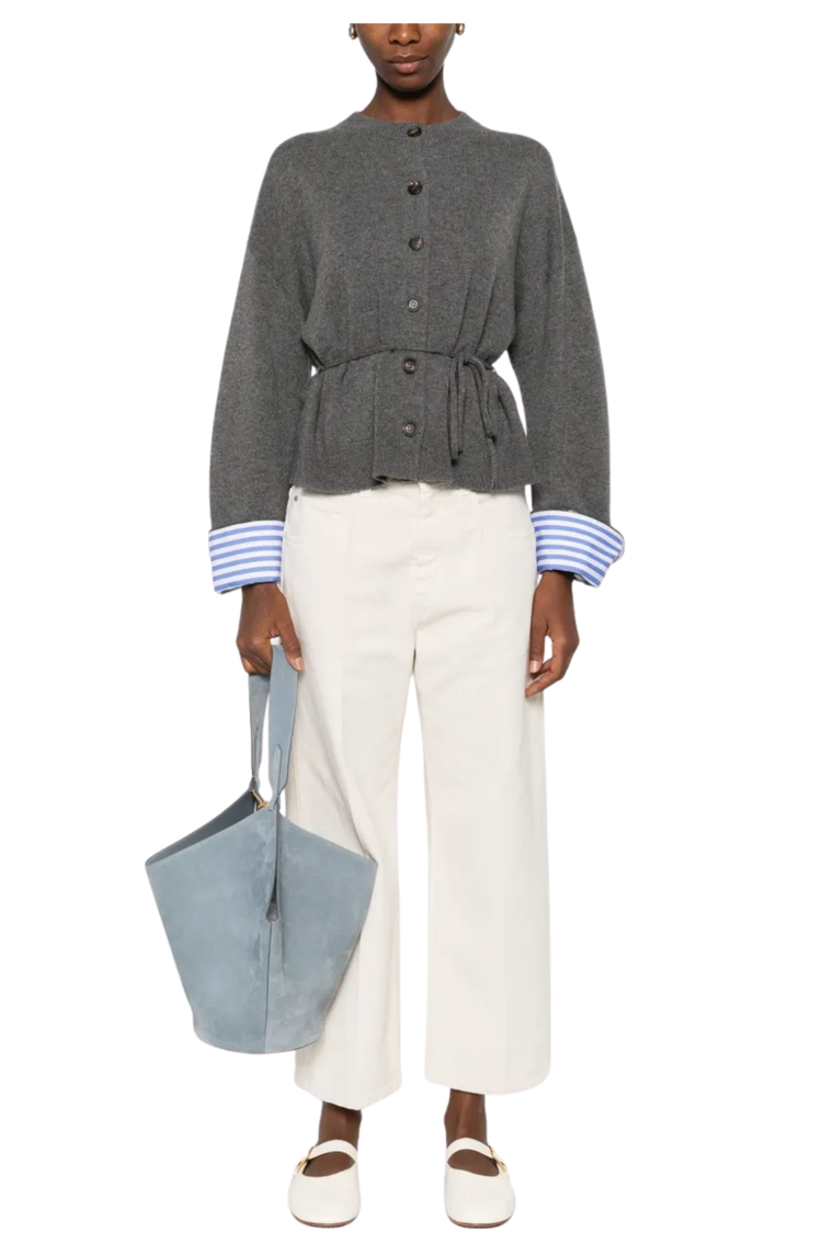 Brunello Cucinelli’s cashmere cardigan features a straight, boxy fit with extended shoulders and a tie-waist for subtle definition. Contrasting cuffs adorned with delicate monili beads add refined sparkle, while the fine knit and button placket highlight its timeless elegance. Crafted in Italy, it’s a versatile piece of understated luxury.